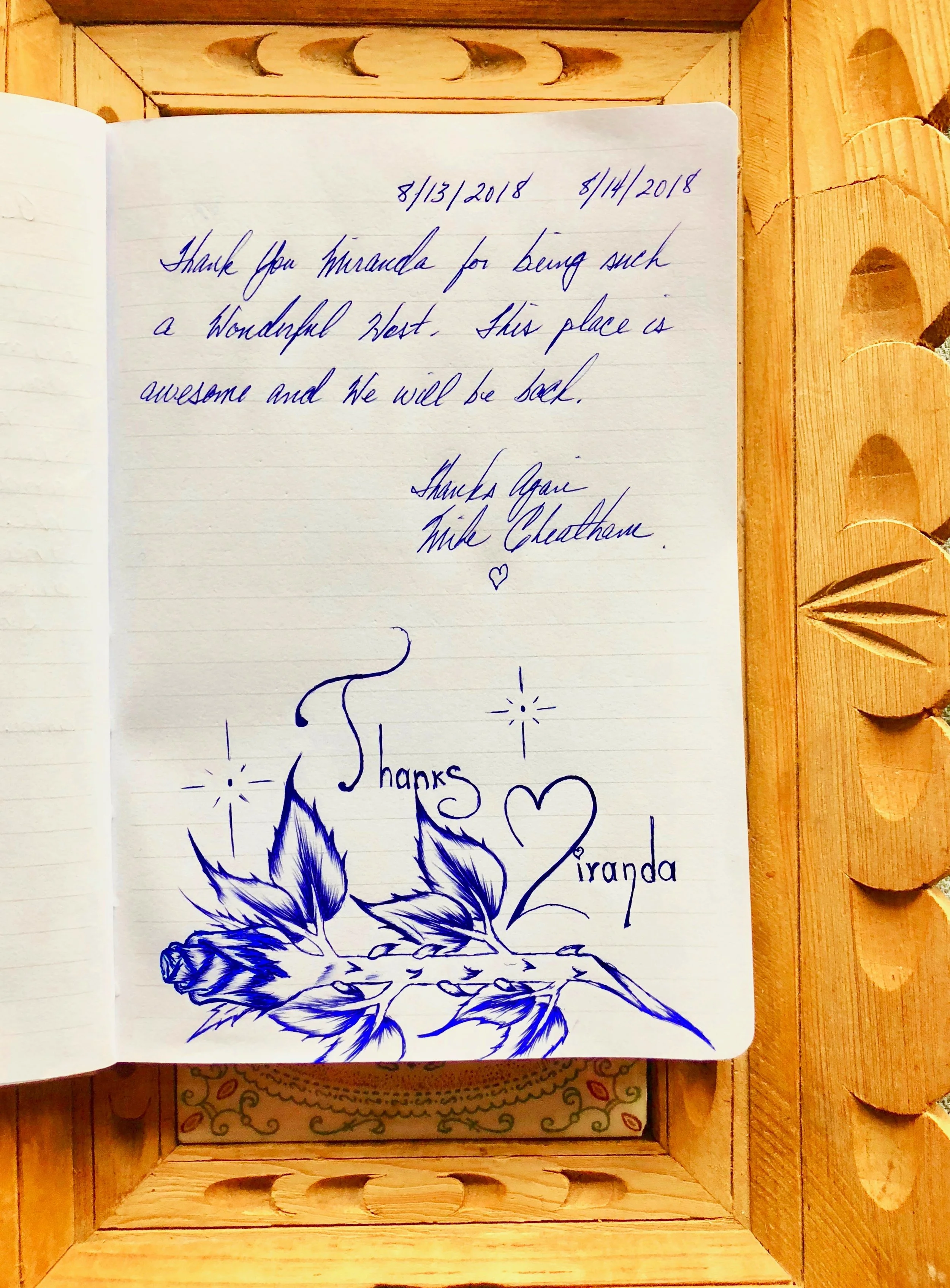 The following notes are excerpts from guests' reviews written in the notebooks provided in each room.